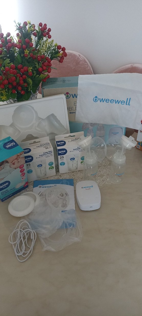 Weewell göğüs pompası seti Kolay ve verimli kullanım için çeşitli aksesuarlar içerir. hamileyken kullanırım diye aldım ama hiç kullanmadım sadece açılıp yıkandı. göğüs pedi iki veya 4 tane içinden kullandım. süt saklama poşeti de biri hiç açılmadı içinde 25 tane var diğer paket de içerisinde 14 tane var. göğüs pompası sessiz çalışır taşıma çantası içindedir. taşınma sırasında kutusu kirlenmiş ama kullanıma asla engel değildir .
