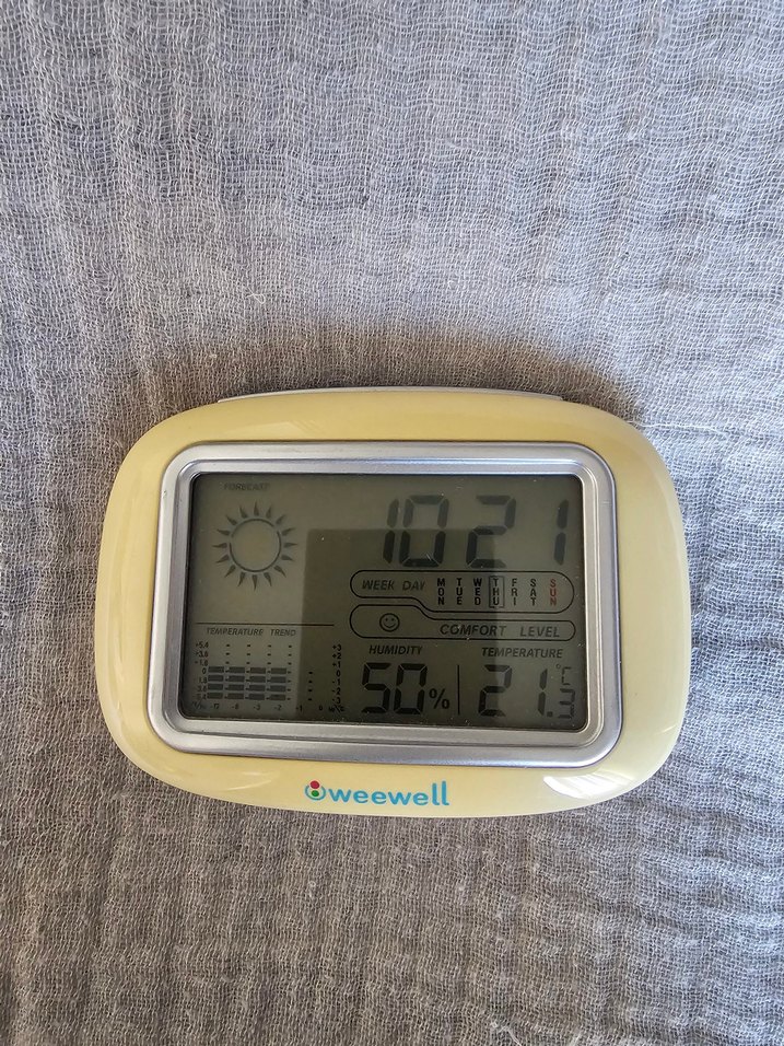 Weewell dijital cihaz, sıcaklık ve nem ölçer, ekranında konfor seviyesini gösterir. Gri ekranda okunması kolay rakamlar ve simgeler bulunur. ️ Çalışmasında hicbor sorun yok, renkte sararma var