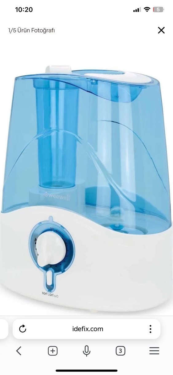 Ayarlanabilir düğmeli, 5 lt şeffaf su hazneli açık mavi renkli nemlendirici cihaz.