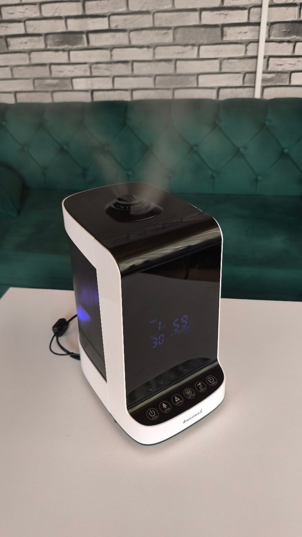 Dijital ekran ve dokunmatik kontrollerle beyaz hava temizleyici ve nemlendirici cihaz, üstten buhar çıkarır.