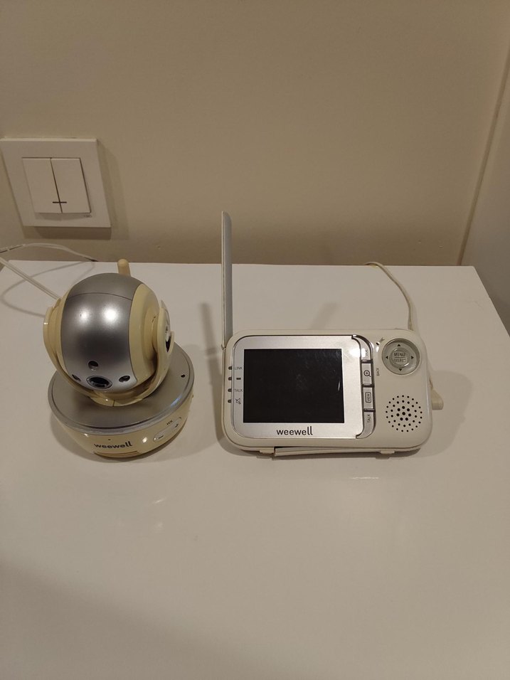 Weewell marka beyaz ve gri renkli bebek kamerası, görüntü ve ses takibi sağlar.