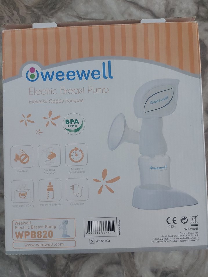 Weewell WPB820 beyaz renkli, ayarlanabilir hız ve BPA içermeyen malzemelere sahip elektrikli göğüs pompasıdır. Yumuşak silikon başlık, şişe ve şarj cihazı dahildir.
