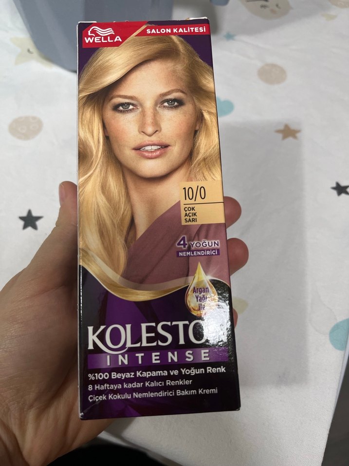 Wella Kolesto Intense 10/0 çok açık sarı saç boyası, %100 beyaz kapama ve yoğun renk sağlar. Argan yağı içeren nemlendirici bakım kremi ve çiçek kokusu ile 8 haftaya kadar kalıcıdır. 1 çay kaşığının yarısı kadar anca kullanıldım sıfır neredeyse bana uymadı başka alacağım.