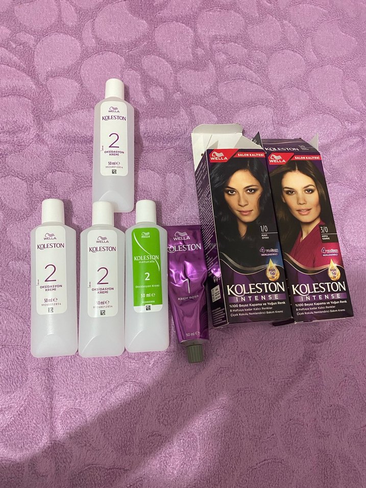 Wella Koleston saç boyası seti, renk kremi ve oksidan şişeleri içerir. Canlı ve derin renk sonuçları sağlar. 3 adet oksidan hiç açılmadı. 50 ml(3 adet 150 ml oksidan) 1 adet oksidan da kullanıldı. Ve içinde çok az var. 1/0 mavi siyah saç boyası da yarıya kadar kullanılmış gözüküyor. ( yaklaşık olarak 30 ml var) Artık saçlarımı boyamayı bıraktığım için satıyorum.