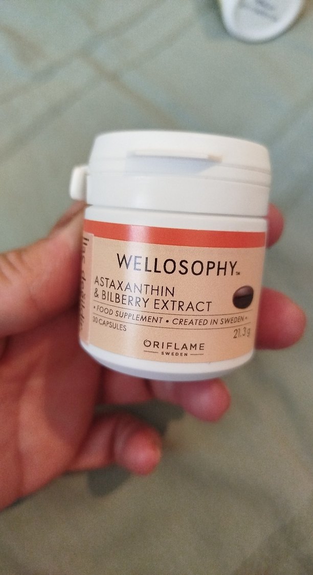 Oriflame Wellosophy markasına ait Astaxanthin ve Bilberry özlü kapsüller, antioksidan desteği sağlar. İsveç'te üretilmiştir.