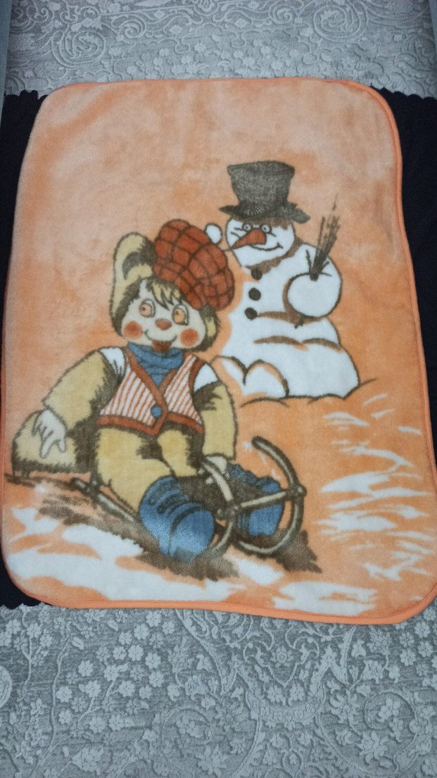 Kahverengi baskılı çocuk battaniyesi, kızakla kayan çocuk ve kardan adam figürlüdür. Yumuşak ve sıcak kumaştan üretilmiştir. Ürün tertemiz ve sorunsuzdur.