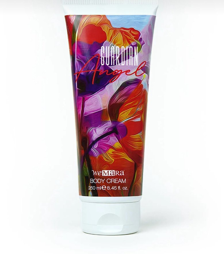 weMaRa Guardian Angel vücut kremi 250 ml tüpte, cildi nemlendirir. Canlı çiçek desenli ambalajıyla bakım rutininize renk katar.