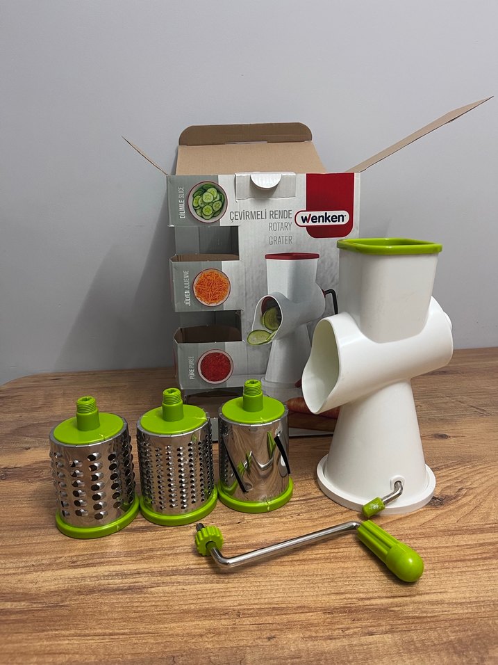 Wenken dönerli rende, beyaz-gri renklerde, dilimleme, rendeleme ve doğrama için değiştirilebilir bıçaklara sahiptir. Kolay kullanım için el krankı bulunur.