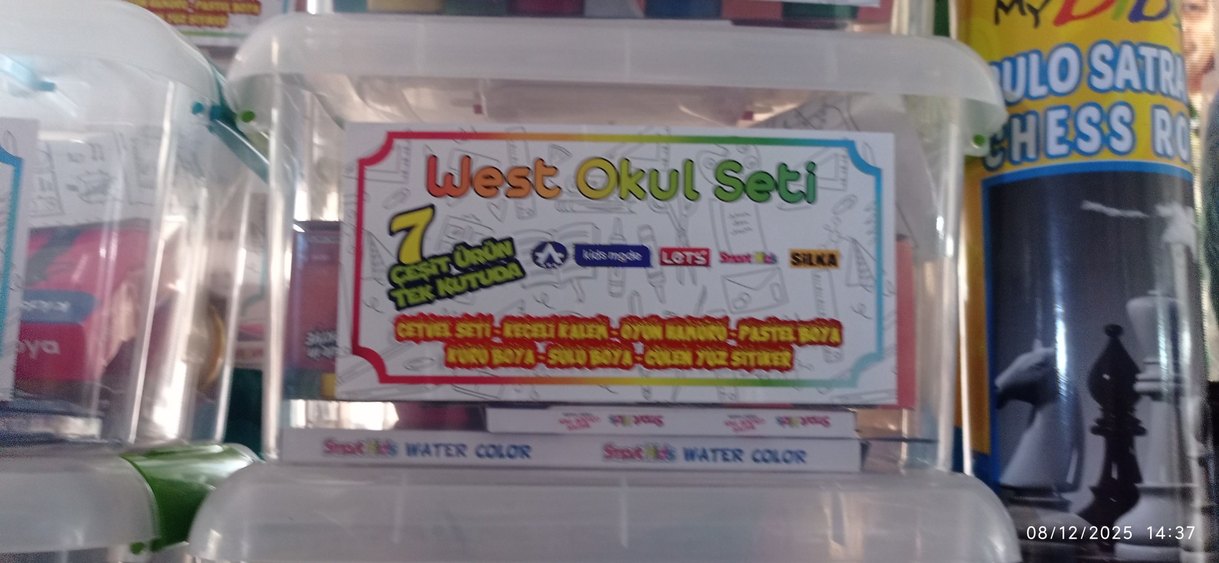 Renkli West Okul Seti, suluboya, pastel ve renkli kalemler gibi 7 farklı boyama aracı içerir.