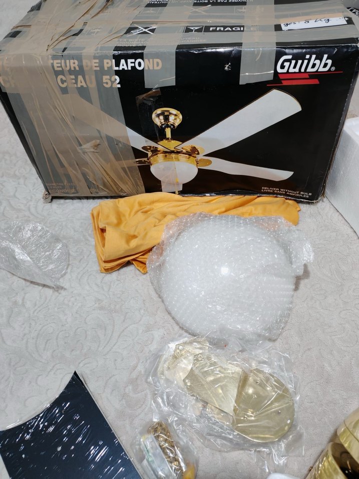 altın renkli kanatlara sahip tavan vantilatörü. Cam ışık armatürü ve montaj parçaları ile birlikte gelir.