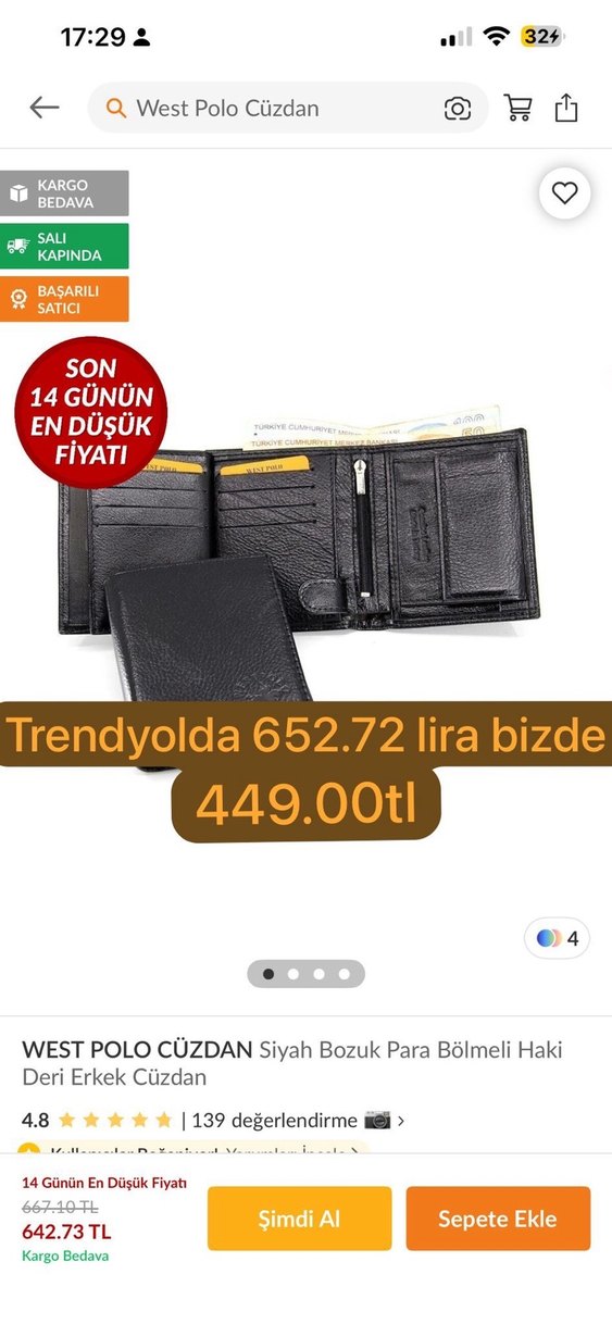 West Polo markalı, hakiki deri erkek cüzdan satılıktır. (Marka listede bulunmadığı için sistem gereği “özel yapım” seçilmiştir.) • Şık ve klasik tasarım • Çok bölmeli (kart, kağıt para ve fermuarlı bozuk para gözü) • Yumuşak ve kaliteli hakiki deri • Temiz, sorunsuz, kullanıma hazır Piyasada 600–650 TL civarında satılan ürünü, 449 TL gibi uygun bir fiyata bırakıyorum. İhtiyaç fazlası olduğu için satıyorum. Fiyat son, pazarlık yoktur. Ciddi alıcılar mesaj atabilir.