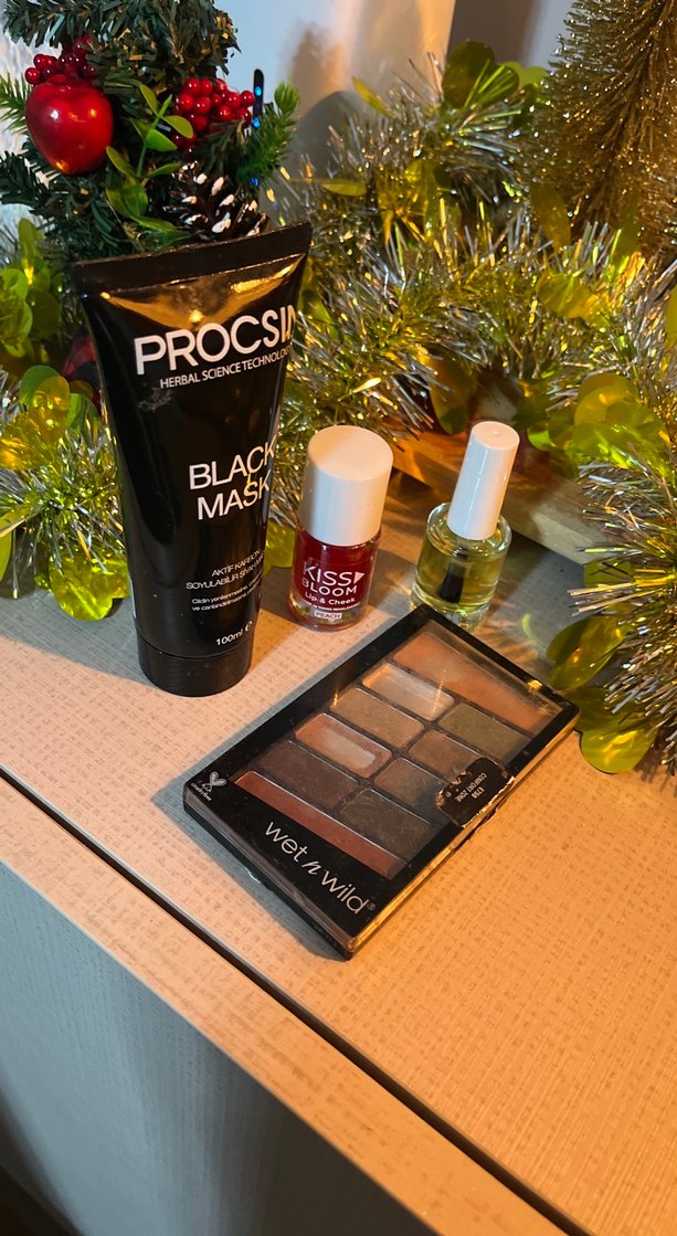 Wet n Wild göz farı paleti, Procsia siyah maske, kırmızı Kiss Bloom dudak ürünü ve şeffaf oje içerir. Toplu fiyat