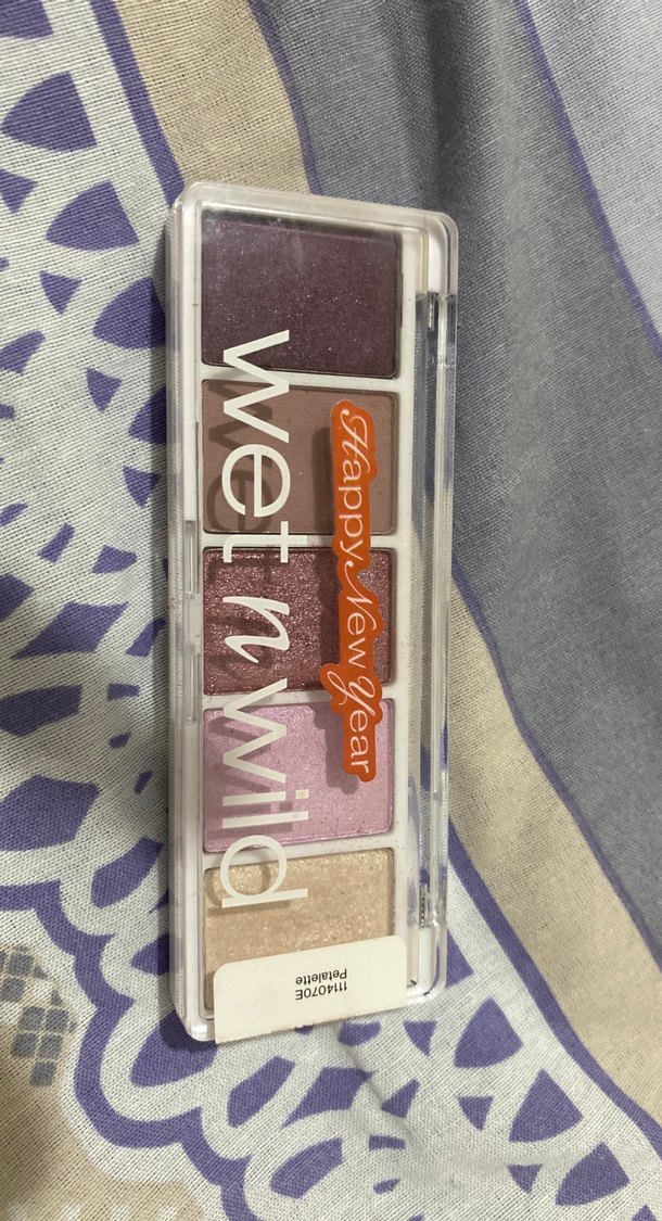 Wet n Wild göz farı paleti, açık ve canlı bej ile mor tonlarında ışıltılı renkler içerir. Beş renkli palet çeşitli makyajlar için uygundur. Sadece iki renk denendi ✨