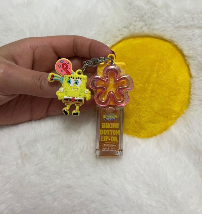 Özel seri renkli Sünger Bob ve çiçek şeklinde lip oil tutucu anahtarlık. "BIKINI BOTTOM LIP-OIL" yazısı bulunur. FİYAT TEKLİFE AÇIK