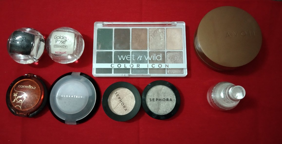 Wet n Wild Color Icon göz farı paleti, çeşitli bej ve koyu tonlar içerir, yanında iki parıltılı Sephora tekli far bulunur. Diğer markalardan göz farları ve allıklar da mevcut.
