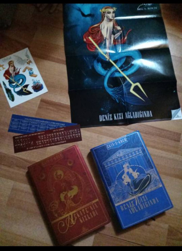 CİLTLİ, AYRAÇLI, POSTERLİ, STİCKERLI İki roman, büyük bir deniz kızı posteri ve iki cetvelden oluşan deniz temalı kitap seti.