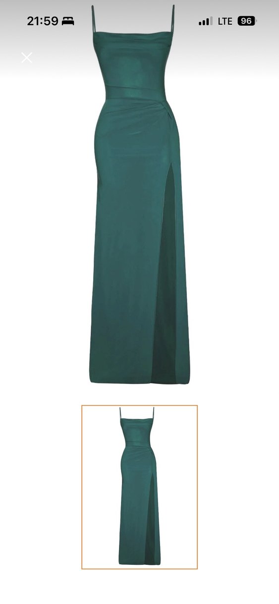 Bu Zümrüt yeşili uzun elbise, vücuda oturan kesimi, derin yırtmacı ve drapeli detaylarıyla dikkat çeker. İnce askılıdır, yumuşak sentetik kumaştan üretilmiştir.