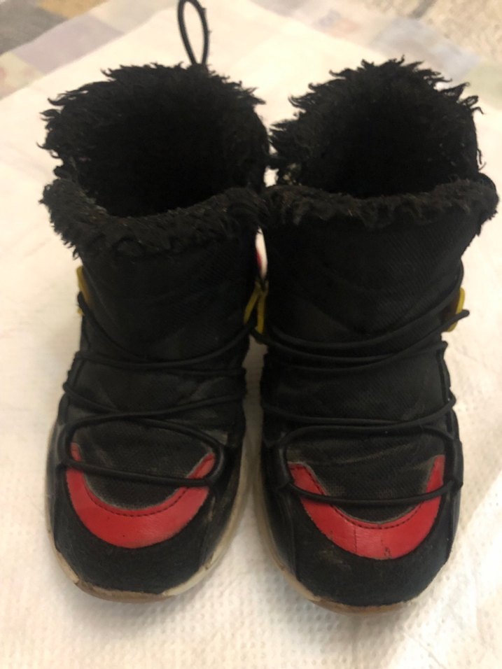 Kürklü detaylı, kırmızı ve siyah renkli kauçuk erkek çocuk botu, avant-garde tarzda ve trend belirleyici özellikte.
