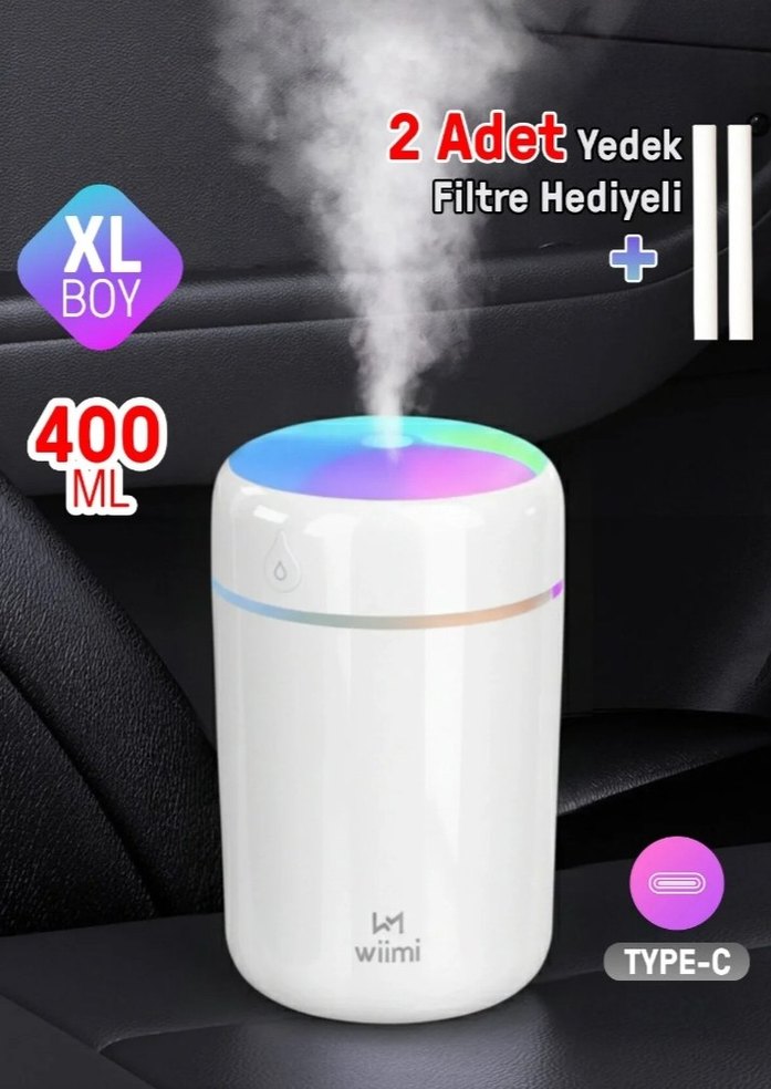 Wiimi hava temizleyici ve nemlendirici, 400 ml kapasite ve Type-C şarj ile. 2 adet yedek filtre ve hafif renk tasarımıyla iç mekan havasını tazeler.