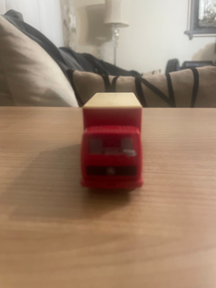 Küçük kırmızı oyuncak kamyonet, renkli tasarıma sahip. Bej renkli yük bölümü bulunur.