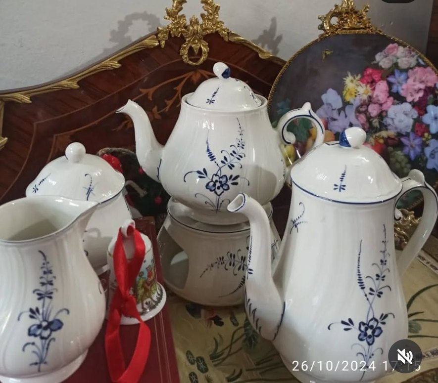 Mavi çiçek desenli beyaz Porselen Demlik, Isitici, Caypot, Sütlük,Recellik, Toplam 5 adet.