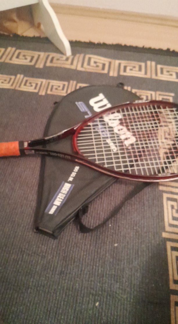 Wilson marka koyu kahverengi tenis raketi, turuncu sap ve taşıma kılıfı ile birlikte gelir.