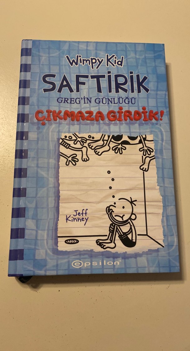 Jeff Kinney'nin yazdığı "Wimpy Kid Saftirik Greg'in Günlüğü Çıkmaza Girdik" kitabı, Greg'in günlüğü ve komik çizimlerini içerir.