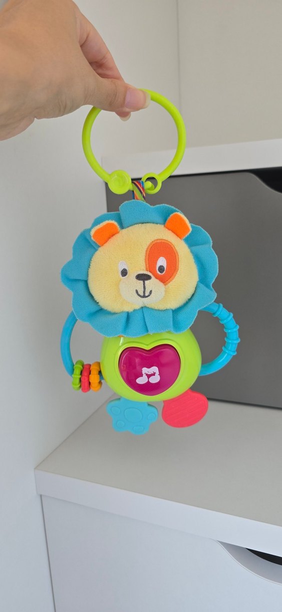 Yumuşak kumaşlı, renkli aslan figürlü diş kaşıyıcı ve çıngırak oyuncak, bebekler için etkileşimli özelliklere sahip. Müzikli ve ışıklıdır. Sağlam, bir kusuru yoktur. Pil bilgisi fotografta mevcuttur.