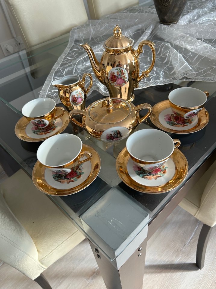 Ürün vitrin ürünüdür kullanılmamış fakat taşınmalardan dolayı minik çizik ve hasarı var resimlerde ekledim porseleni ince ve şık 4 adet fincan ve tabağı 1 adet şekerlik 1 adet demlik 1 adet sütlük mevcut