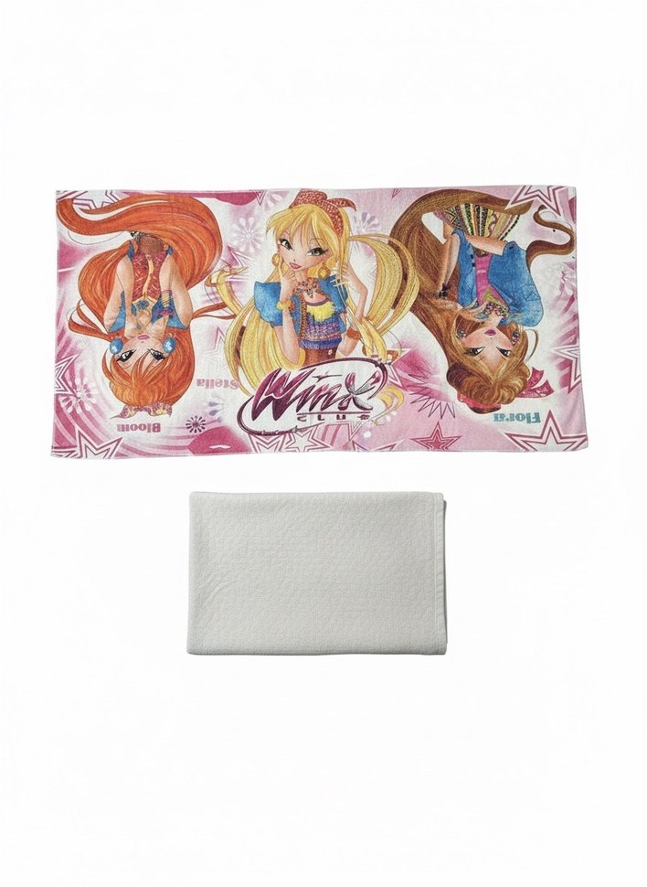 Beyaz tabanlı, pastel renkli pop kültür baskıları ve Velcro kapamalı çocuk odası halısı. Bohem ve retro tarzı yansıtıyor. Winx baskılı
