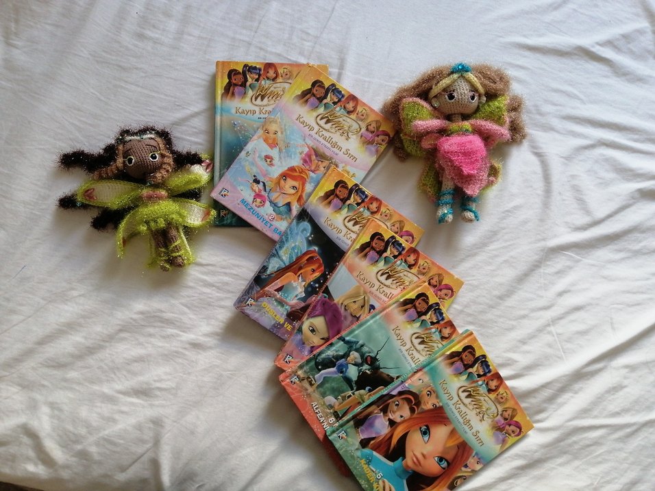 Winx Club karakterlerinin renkli kapaklarıyla çocuk kitapları seti. İlk 6 kitap var. Kurşun kalemle çizilmiş etkinlilşer var bazı kitaplarda ancak silinebilir. Bazı sayfaların ucları katlanmış onların izleri de var. Kitaplardan birinin iki sayfası yapışmıştı o kısım da açarken minik bir hasar aldı ama bu ufak tefek kusurlar dışında tertemizler. Set halinde satıyorum. Bebekler sete dahil değil.