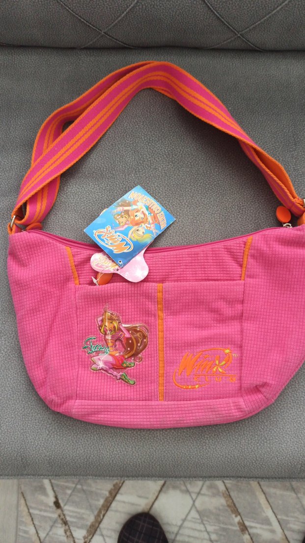 Pembe gövde ve renkli çizgili omuz askısına sahip, önünde peri deseni bulunan yumuşak dokulu çocuk okul çantası.