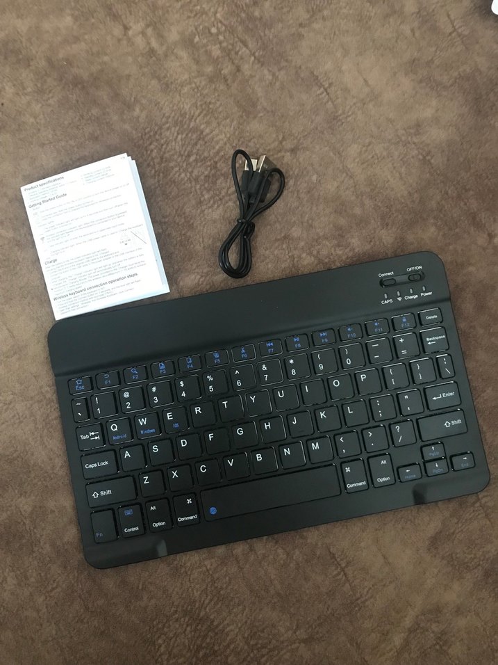 Tam QWERTY düzenine sahip, Wıreless bağlantılı kompakt siyah şarjlı klavye ve kullanım kılavuzu içerir.