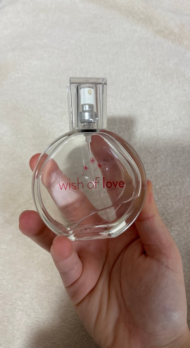 Şeffaf yuvarlak şişede, spray başlıklı Wish of Love kadın parfümü. Zarif ve romantik bir koku sunar.