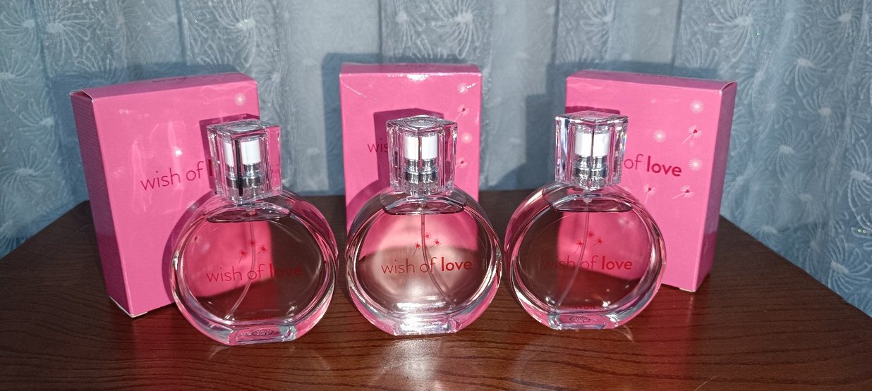 Yuvarlak cam şişede, şeffaf kapaklı Wish of Love kadın parfümü, pembe kutusuyla romantik ve zarif bir koku sunar.