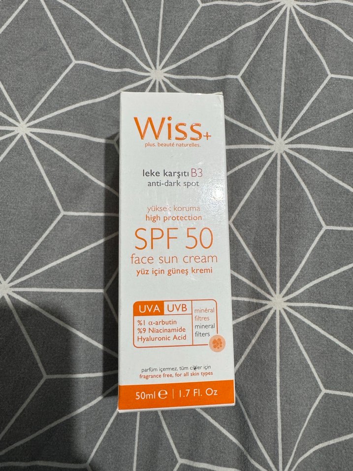 Wiss+ SPF 50 yüz güneş kremi, leke karşıtı arbutin, niacinamide ve hyaluronik asit içerir. UVA ve UVB ışınlarına karşı yüksek koruma sağlar, parfümsüzdür.