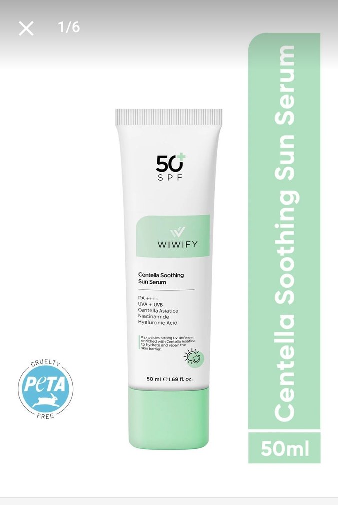 WiWIFY Centella Güneş Serumu SPF 50 koruma sağlar, Centella Asiatica ve Hyaluronik Asit içerir. Cildi yatıştırır ve UV hasarına karşı korur.