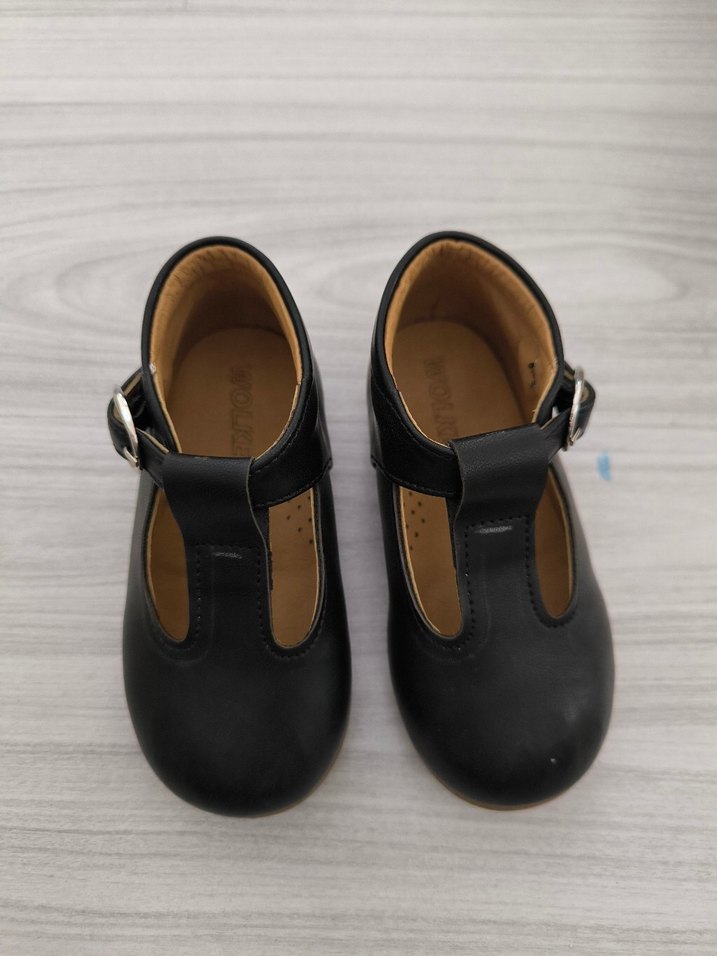 Kız çocukları için tokalı siyah babet ayakkabı, düz kauçuk yüzeyli, gotik tarzı yansıtır. 22 numara tertemiz