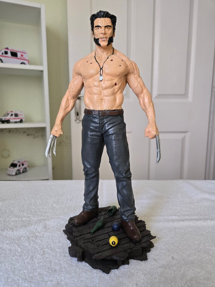 Kaslı, gömleksiz aksiyon figürü, koyu gri pantolon ve kahverengi ayakkabılarla. Ellerinden metal pençeler çıkıyor. Detaylı yüz ifadesi ve aksesuarlarla birlikte. ♂️