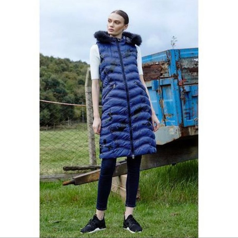Kürklü kapüşonlu, yüksek yakalı, kolsuz uzun mavi kadın yelek. Denim kumaştan, bağlamalı desenli ve sokak stiline uygun dış mekan kullanımı için tasarlanmıştır.