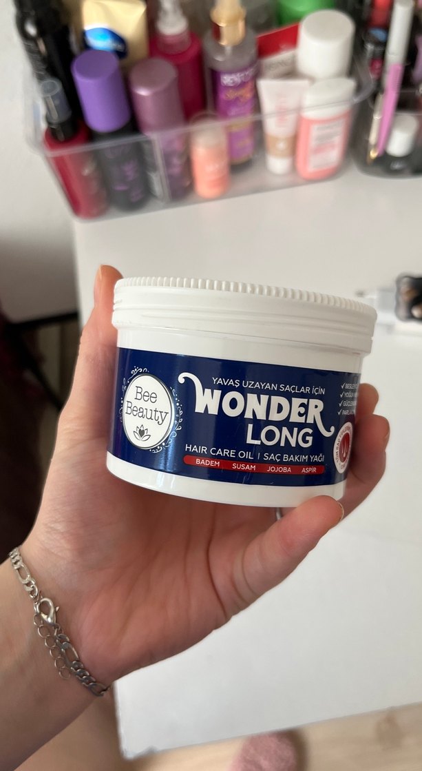 Yavaş uzayan saçlar için badem, susam, jojoba ve kayısı yağları içeren Wonder Long saç bakım yağı. Çok az kullandım çok ürünüm olduğu için kullanmıyorum kokusu çok güzel