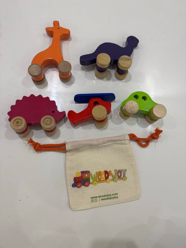 5 adet Wood&Joy markasına ait renkli doğal ahşap tekerlekli oyuncak, kese hediyedir. Kendi sayfasında tanesi 350 TL’dir