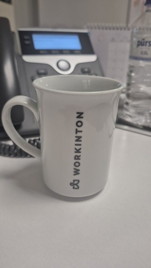 Dikey olarak gri Workinton logosu bulunan beyaz seramik kupa. Sağlam kulplu ve pürüzsüz yüzeylidir, sıcak içecekler için uygundur. ☕