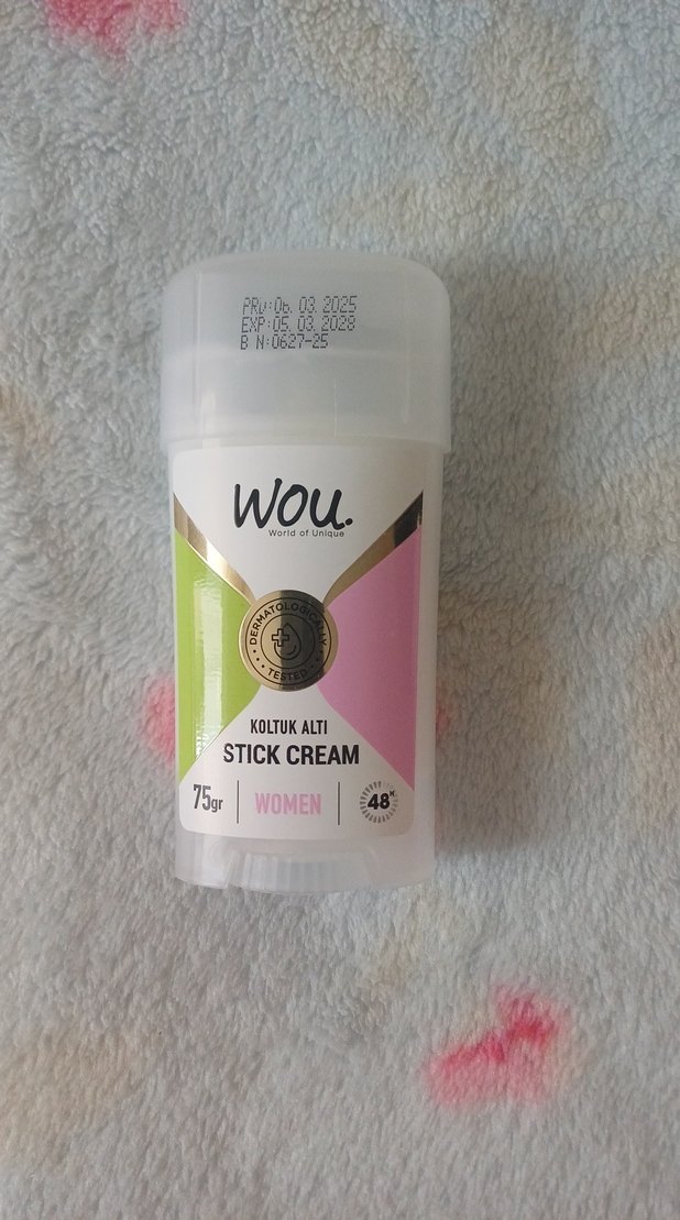 Fazladan almıştım birini satıyorum. Wou kadın koltuk altı stick krem deodorant, 48 saat koruma sağlar ve 75 gram stick formundadır. Yumuşak krem yapıya sahiptir.