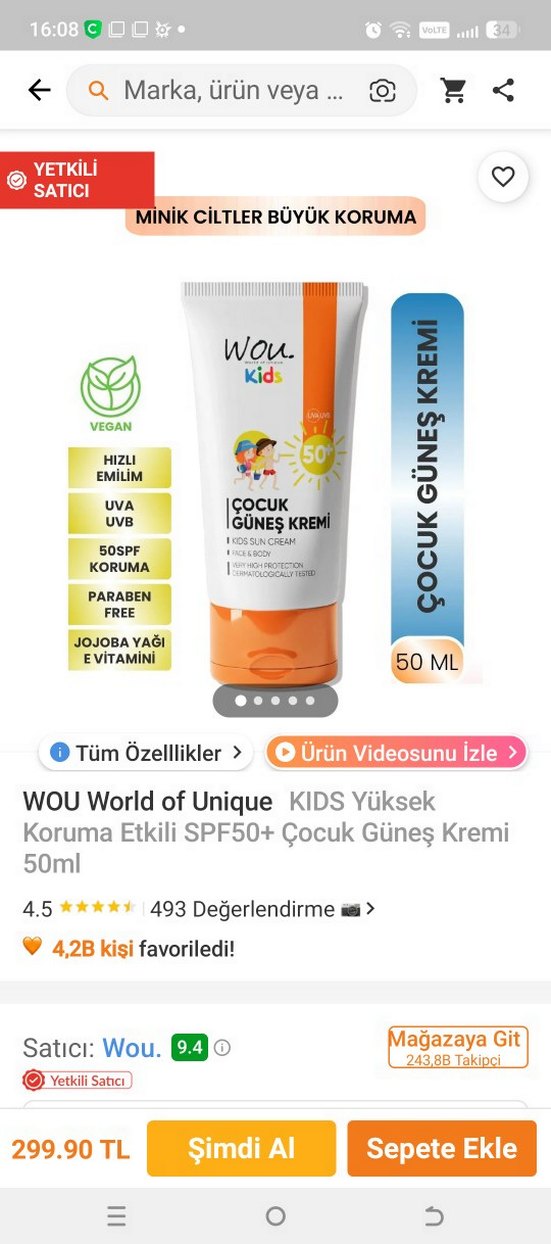 urun sıfır ambalajında WOU Kids çocuk güneş kremi SPF50+ koruma sağlar, vegan ve paraben içermez. Hızlı emilir, jojoba yağı ve vitaminlerle zenginleştirilmiştir. UVA ve UVB koruması sunar. ☀️