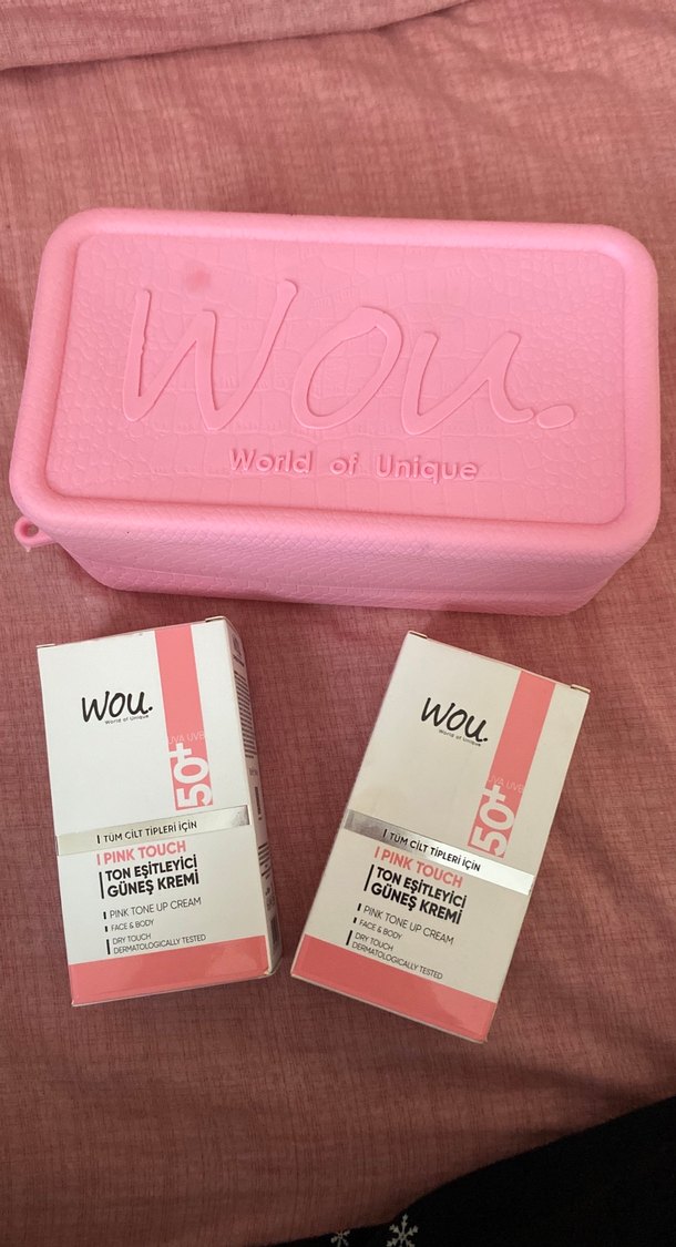 Wou Pink Touch ton eşitleyici güneş kremi SPF 50+ koruma sağlar ve cildi yumuşatır. Pembe saklama kutusu ile birlikte gelir.