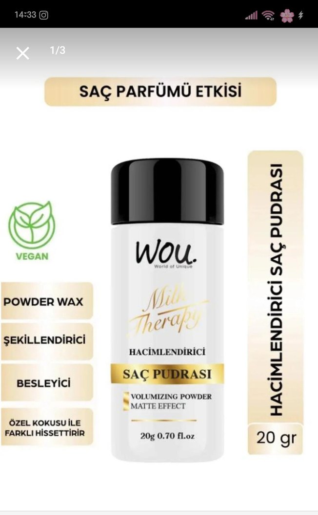 Wou vegan saç pudrası, mat etki ve besleyici formülü ile saçları şekillendirir, hacim kazandırır. Özel kokusu farklı hissettirir. 20 gr. ✨