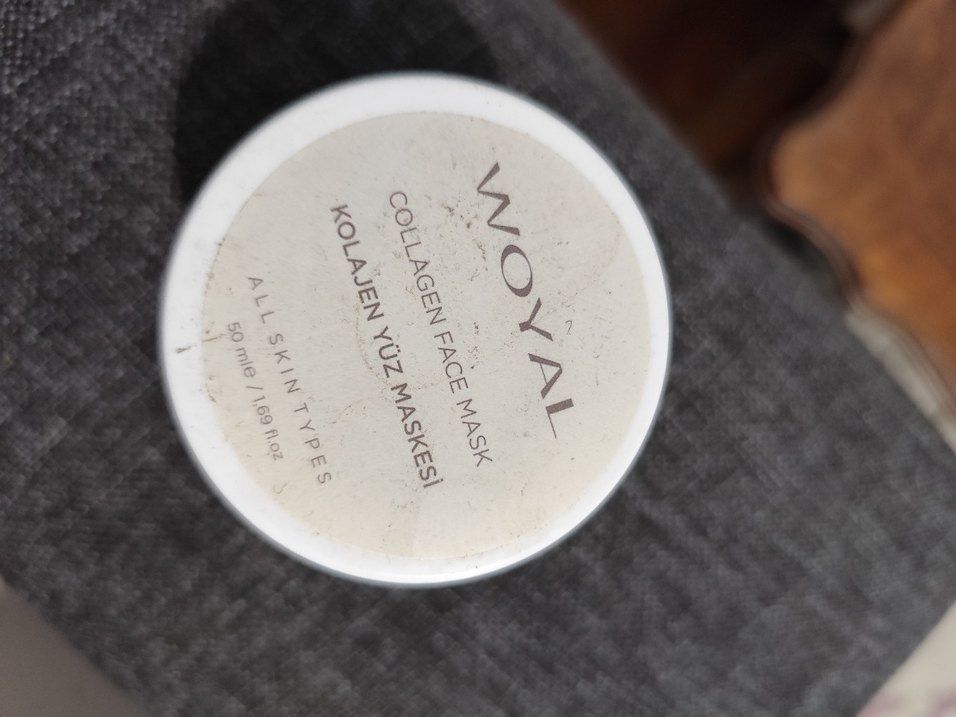 Woyal kolajen yüz maskesi, bej ve gri ambalajda, tüm cilt tipleri için uygundur. 50 ml ürün içerir.
