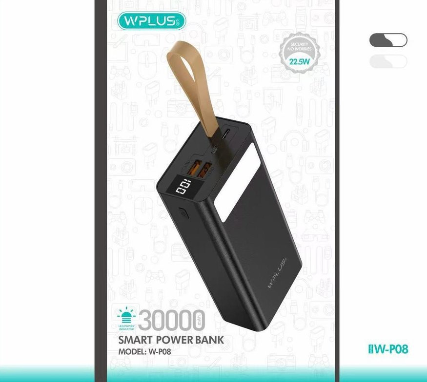 WPLUS power bank, 30000mAh kapasite, 22.5W çıkış gücü ve dijital ekran ile. Akıllı şarj teknolojisi ve kullanışlı deri askısı bulunur.
