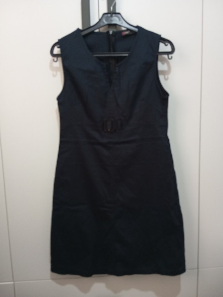 Kolsuz siyah midi elbise, V yaka ve kemerli bel detayı ile regular fit sunar. Minimalist gotik tarzı ofis kullanımına uygundur. gabardin kumaş. pamuklu. 36,38 beden